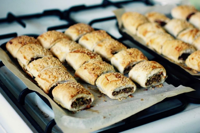 Roll out the pastry into thin sheets and apply the filling as you would for normal sausage rolls.